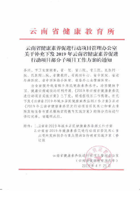 云南省健康素养促进行动项目办公室关于2019年云南省健康素养促进行动项目实施方案的补充通知 内含多个文件资料,数据较大,请点击此处下载源文件到本地电脑查看阅读!