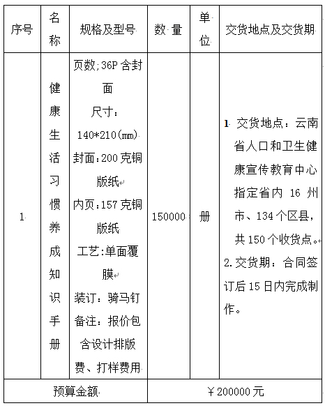 根据《中华人民共和国政府采购法》、《中华人民共和国政府采购法实施条例》、《政府采购非招标采购方式管理办法》等有关法律、法规及云南省人口和卫生健康宣传教育中心采购的相关规定,我单位依法对健康中国行项目健康生活习惯养成知识手册制作采用询价方式采购。本项目采购计划已获得中心主管领导批准,资金已落实。欢迎具有相应资格及供货能力的投标人参加投标。