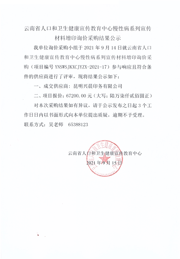 下一篇:云南省人口和卫生健康宣传教育中心健康中国行活动用品询价采购(第二次)流标公告