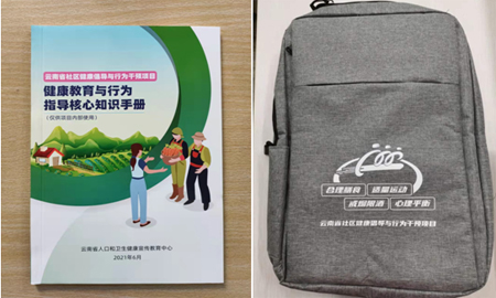 为提升居民健康素养水平,2021年1月25日下发《云南省卫生健康委办公室关于组织实施社区健康倡导与行为干预项目的通知》(云卫办宣传发〔2021〕1 号),9月举办云南省社区健康倡导干预项目推进培训班,各项目县(市、区)相继出台方案,积极启动项目。为促进项目落实,省健康宣教中心制作相应健康倡导员干预支持用品,截止目前,共制作健康教育与行为指导核心知识手册30000份,健康倡导员双肩包6100个,健康倡导员帽子4700顶,并下发至16个州(市)50个项目县(市、区)。
