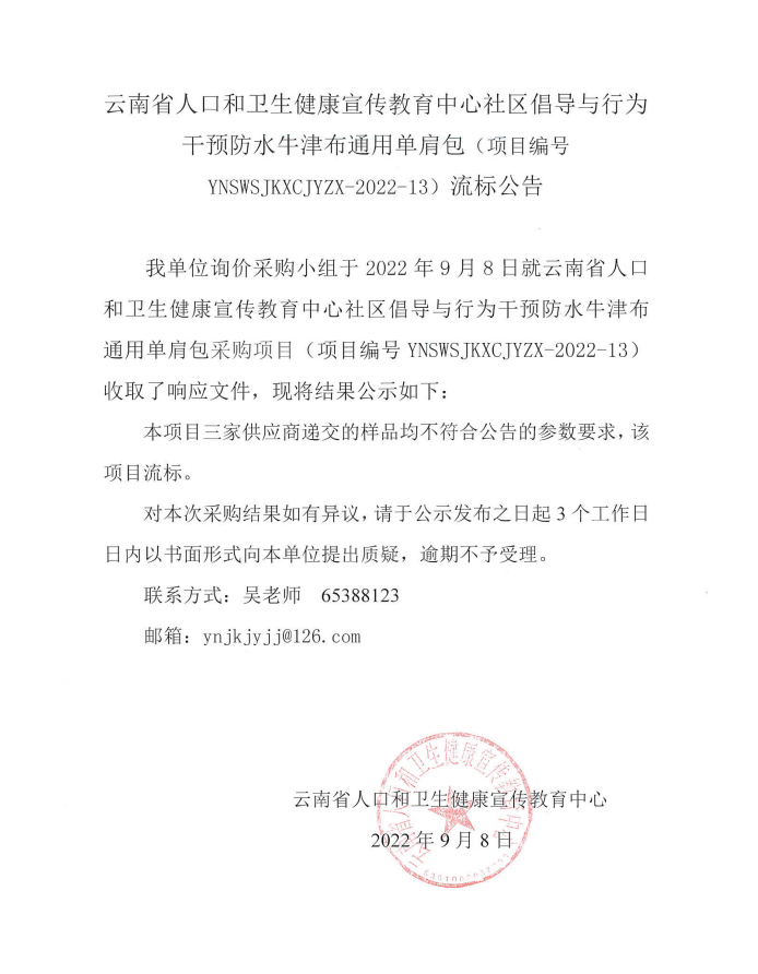 下一篇:云南省人口和卫生健康宣传教育中心控烟宣传实物(项目编号YNSWSJKXCJYZX—2022—14)流标公告