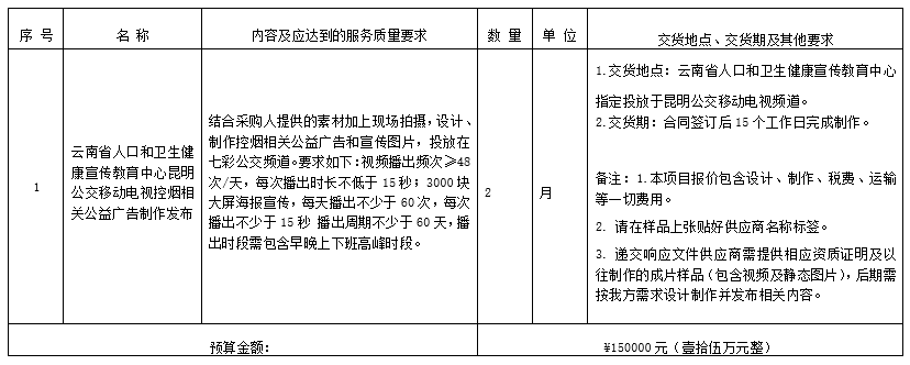根据《中华人民共和国政府采购法》、《中华人民共和国政府采购法实施条例》、《政府采购非招标采购方式管理办法》等有关法律、法规及云南省人口和卫生健康宣传教育中心采购的相关规定,我单位依法对云南省人口和卫生健康宣传教育中心昆明公交移动电视控烟相关公益广告制作发布询价方式采购。本项目采购计划已获得中心主管领导批准,资金已落实。欢迎具有相应资格及供货能力的投标人参加投标。