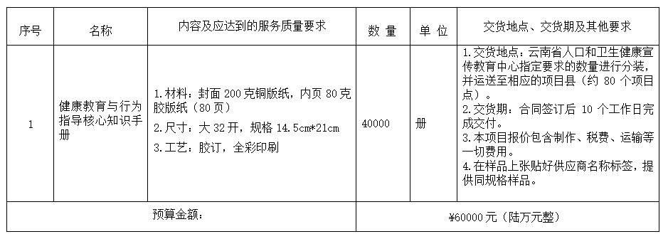 根据《中华人民共和国政府采购法》、《中华人民共和国政府采购法实施条例》、《政府采购非招标采购方式管理办法》等有关法律、法规及云南省人口和卫生健康宣传教育中心采购的相关规定,我单位依法对云南省人口和卫生健康宣传教育中心健康教育与行为指导核心知识手册询价方式采购。本项目采购计划已获得中心主管领导批准,资金已落实。欢迎具有相应资格及供货能力的投标人参加投标。