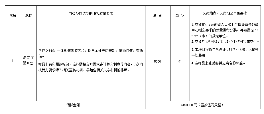 1.1项目名称:云南省人口和卫生健康宣传教育中心防艾主题U盘采购