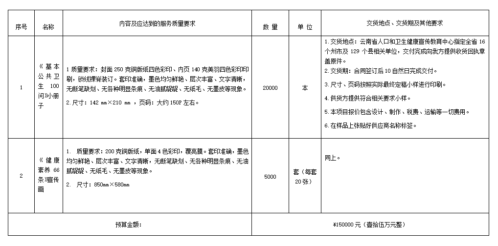 参照《中华人民共和国政府采购法》、《中华人民共和国政府采购法实施条例》、《政府采购非招标采购方式管理办法》等有关法律、法规及云南省人口和卫生健康宣传教育中心采购的相关规定,我单位依法对云南省人口和卫生健康宣传教育中心《基本公共卫生100问》及《健康素养66条》系列宣传材料制作询价方式采购。本项目采购计划已获得中心主管领导批准,资金已落实。欢迎具有相应资格及供货能力的投标人参加投标。