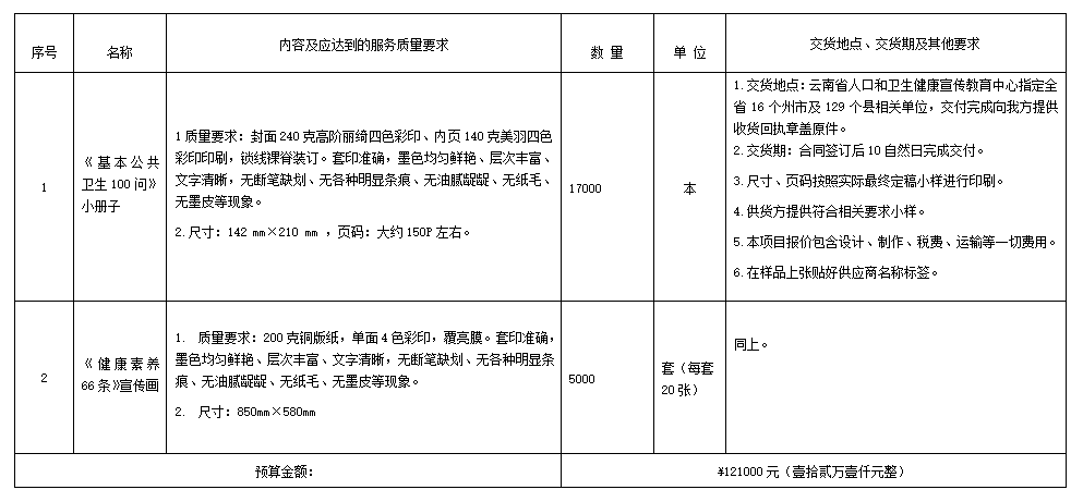 参照《中华人民共和国政府采购法》、《中华人民共和国政府采购法实施条例》、《政府采购非招标采购方式管理办法》等有关法律、法规及云南省人口和卫生健康宣传教育中心采购的相关规定,我单位依法对云南省人口和卫生健康宣传教育中心《基本公共卫生100问》及《健康素养66条》系列宣传材料制作询价方式采购。本项目采购计划已获得中心主管领导批准,资金已落实。欢迎具有相应资格及供货能力的投标人参加投标。