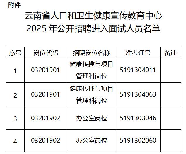 报考云南省人口和卫生健康宣传教育中心2025年面向社会公开招聘岗位,经资格复审合格人员(名单附后)。